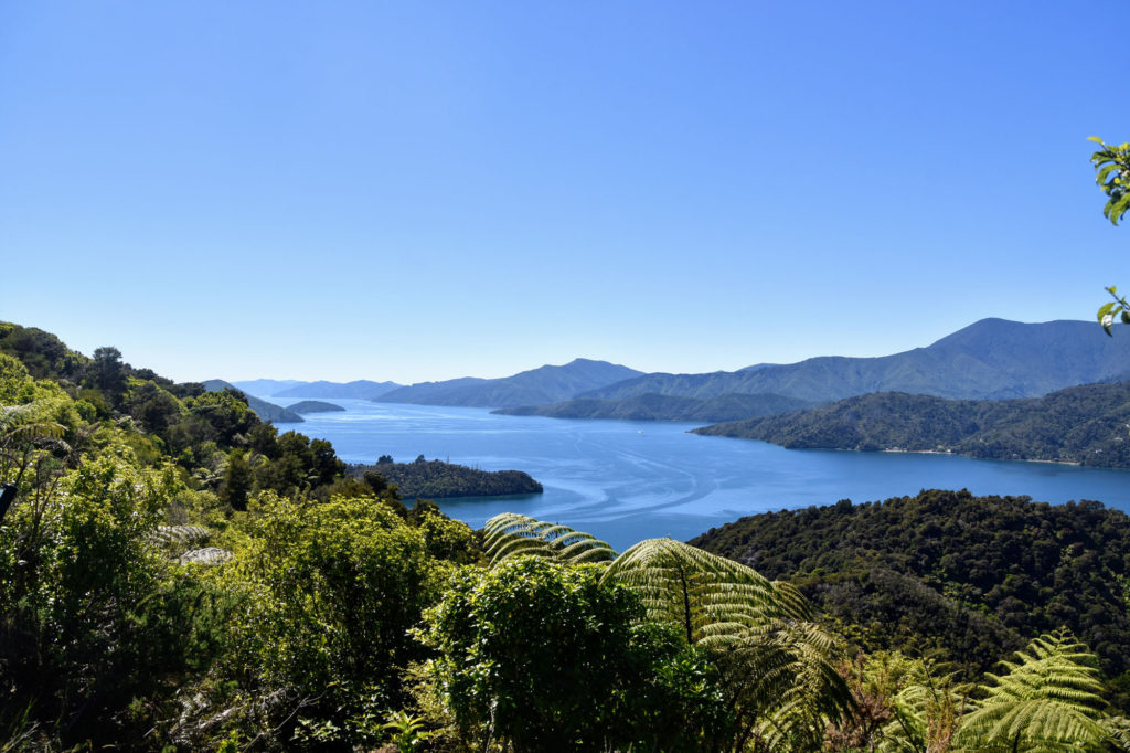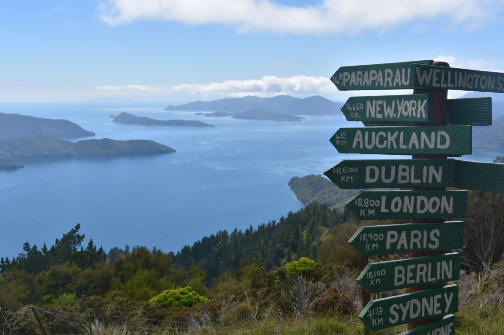 As with the day before, the going was medium- some steep climbs mixed in with ridgeline flats, rough downhills and beach side trails darting through the shrub. It was gloriously beautiful all day, and the tough gradients are made up for the most incredible views from the top. We especially enjoyed Eatwell’s View, which has some fun sign posts showing how far it is to every capital city in the world, as well as far reaching views over private inlets, azure seas and vibrant, dusky mountains fading out into the afternoon horizon. We spent time traversing the ridgeline that divides the Queen Charlotte Sounds and the Kenepuru Sound, so all day we were surrounded on both sides by blue panoramas of mountains, sea and wild coast lines. We also traversed a lovely mix of cool beech forests, interspersed with manuka bushes and tree ferns.