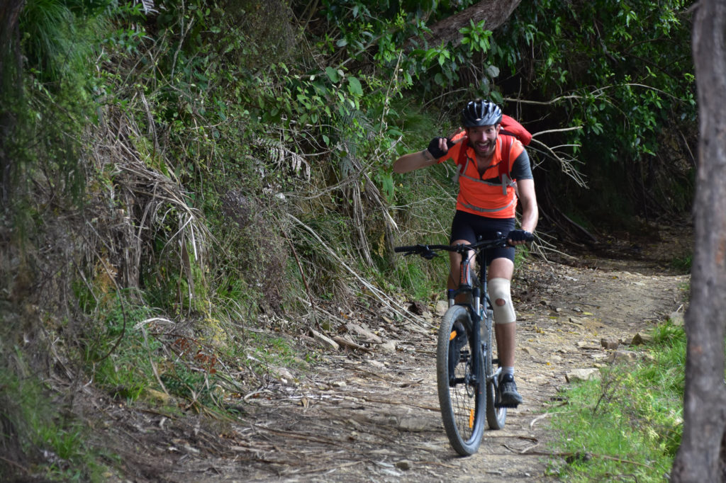 The final descent was rather gnarly- rocky, uneven, twisting, and steep, the track clings to the steep hillside, with a drop plunging down on one side. We were getting a little over confident at this point, and on the final downhill, we had two crashes. The first was me- I was bumping over a rocky section and lost my footing. Unfortunately, I fell to my left, which happened to be down the steep- almost vertical- hillside. I fell at least several metres, slid several more and came to a rest with the bike on top of me in a small stream. All was fine, and I climbed back up in laughter- but then only 10 minutes later, Sven did exactly the same thing! He came off, went sliding down the hillside, and emerged from the bush with tyre tracks across his chest where the bike had hit him.